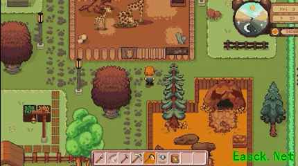 游戏整体是那种很温暖的像素风,音乐也轻柔。每天都会有顾客,陆陆续续把自家的各种奇奇怪怪的宠物送过来,让你帮着带几天。这时候你就得开始忙活了:登记、安置、给这帮小动物搭建栖息地、准备口粮和水,还得时不时清扫粪便。在栖息地旁边,你还可以顺便砍砍树、种种菜、除除草。