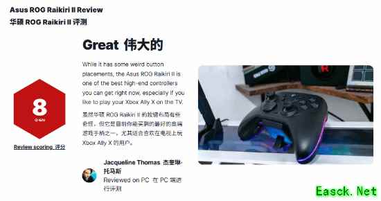 IGN为华硕 ROG Raikiri II手柄打出了8分的高分,称其是“你能买到的最棒的高端手柄之一”。