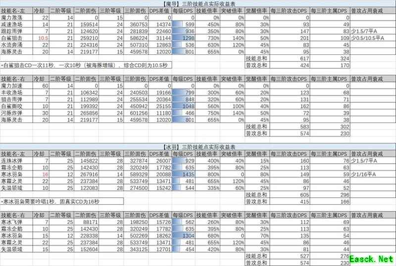 此表展示了每个三阶技能点分配到不同技能或属性所带来的实际DPS提升效果。根据优先分配给收益较高的技能或属性的原则,能够最大程度提升DPS输出。同时,魔导技能中如渔场升级提升精准、海豚升级增强固伤等效果,也已综合计算在加点优先级中,可直接参考使用。