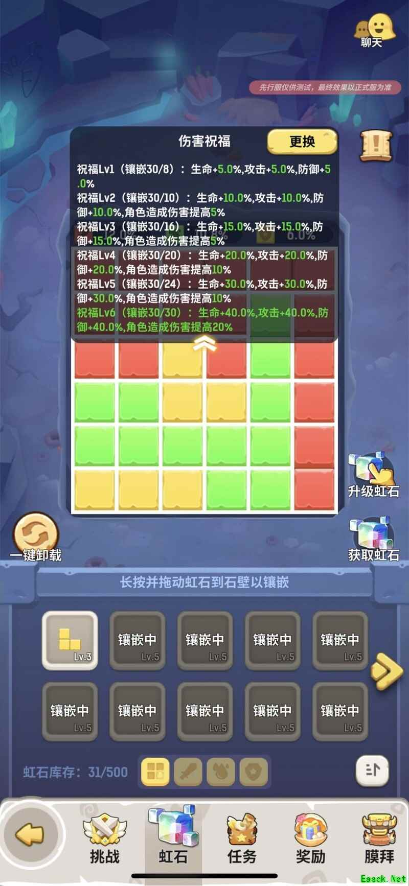 虹石主要通过赛季玩法的宝箱获取,也可以每天用贝壳购买100颗。虹石墙为6×6的格子,共设5个等级,三颗同级虹石可合成一颗更高级的,最高为5级,仅占一格。黄色虹石增强防御,绿色提升生命,红色增加攻击。以红色为例,5级时可提供1%的攻击加成。当虹石墙镶嵌满30颗后,便可激活赛季最强增益效果。祝福效果可自由选择,这里推荐攻击类。技能等级较低的玩家建议选择技能祝福。需要注意的是,5级虹石仍可继续升级,升级后仍为5级,但可以更换颜色。资源充足的玩家可根据喜好调整,例如全部换成绿色,开启护眼模式。希望大家都能顺利完成狩猎挑战赛,冲击前五名的玩家记得定好闹钟。