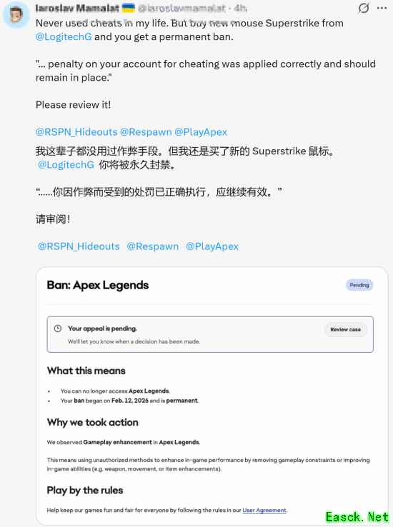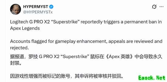 据最新消息,罗技G PRO X2“Superstrike”鼠标,在《Apex英雄》里会直接导致账号永久封禁。被封的账号都会被系统认定为使用了游戏增强功能,玩家就算去申诉,审核后也会被直接拒绝。