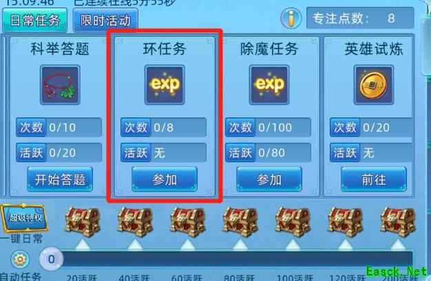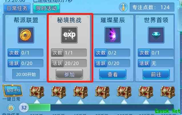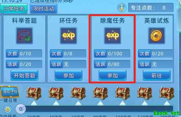 小技巧:完成除魔任务可消耗专注点,获取五倍经验奖励。每次任务均有专注点加成,大幅提升升级效率。参与方式:进入→→,点击即可参加。