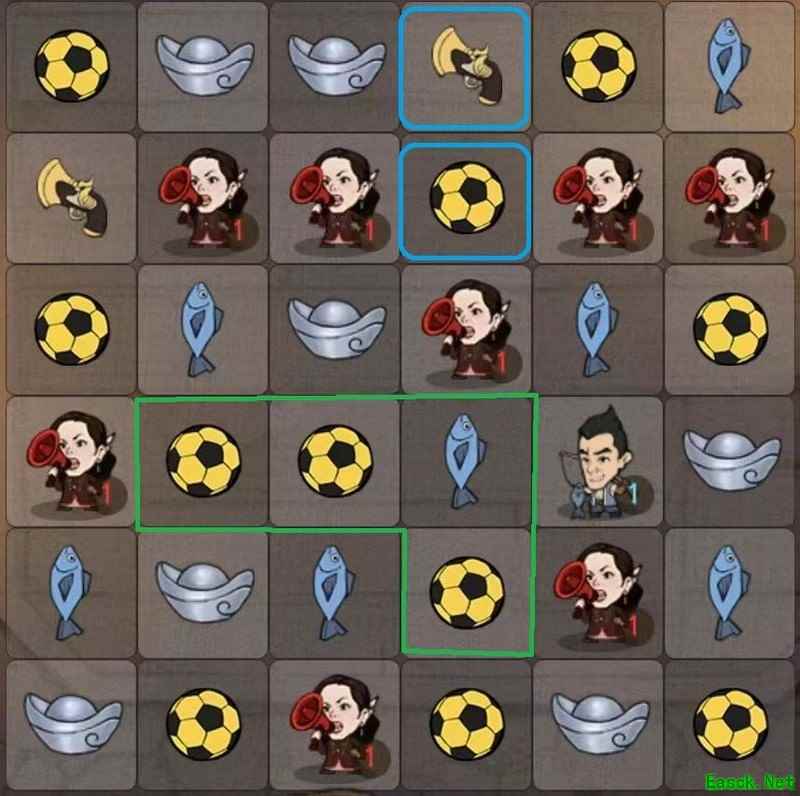 销毁蓝框内的火铳或足球可消除5格,并触发下方绿框合成消除2格,总计消除7格。