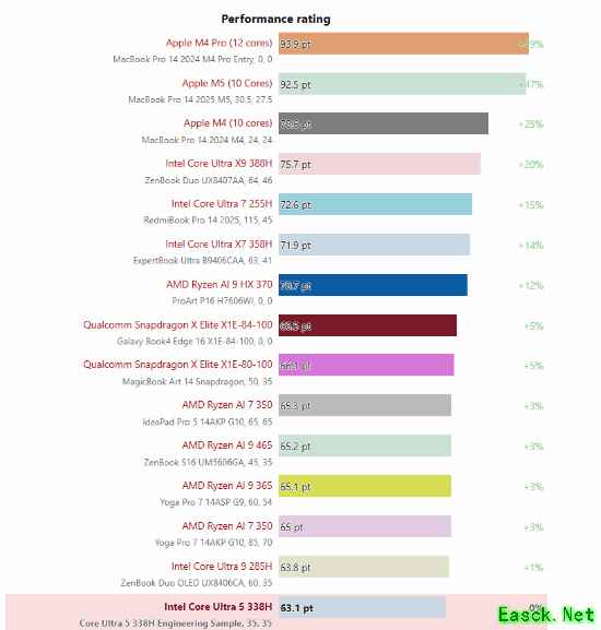 在CPU性能测试中,酷睿Ultra5338H 与AMD Ryzen AI9465在35瓦和45瓦配置下整体表现相当。其中,英特尔处理器在单线程测试中处于领先地位,而 AMD Ryzen芯片则在多线程测试中表现更优。
