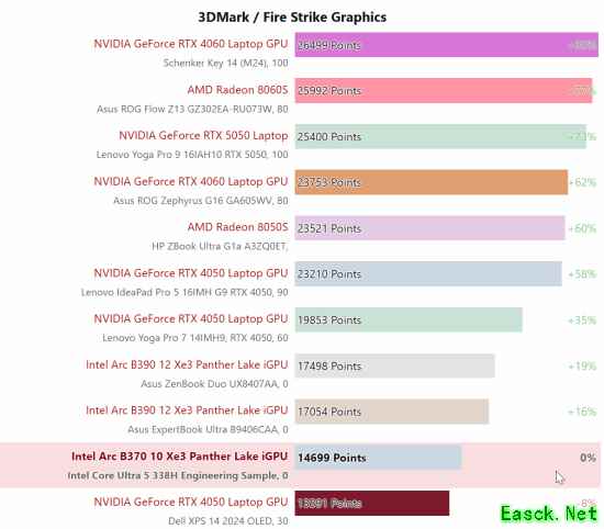 近日,硬件媒体NotebookCheck发布了英特尔第三代酷睿Ultra处理器(代号 Panther Lake)的早期基准测试,其中集成的Arc B370核显表现超出预期,在合成测试中性能达到RTX4050移动版(RTX4050Laptop GPU)水平,引发行业关注。