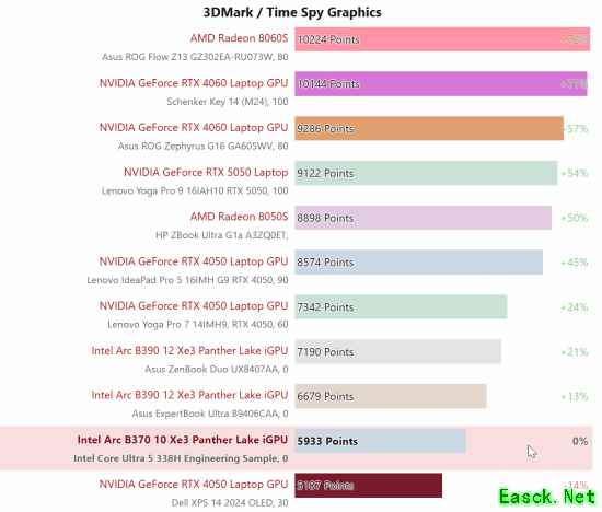图形性能方面,Arc B370核显在3DMark Time Spy测试中获得5933分,这一成绩与RTX4050移动版基本持平。与同系列更高规格的 Arc B390核显相比,Arc B370在该测试中慢约 11%(Arc B390 得分 6679-7910 分,具体取决于笔记本机型);在Steel Nomad 测试中,Arc B370得1376分,Arc B390得 1667 分,Arc B370慢约17%。值得一提的是,Arc B370和Arc B390均显著优于英特尔前代集成显卡产品,如Arc Graphics140V和Arc Graphics140T。