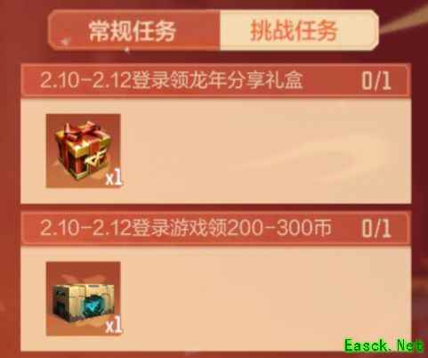 2月10日至12日期间,玩家们登录游戏后可前往挑战任务领取和各一个。其中,CFM币礼盒内含大量龙年CFM币,最低可获得200枚,最高可达300枚,数量随机,等你来拿。