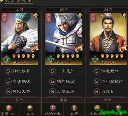 诸葛亮为主将,搭配夺魂挟魄与风助火威;赵云携带破阵摧坚和火炽原燎;刘备则配备八门金锁阵与白毦兵。