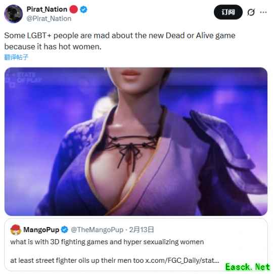 游戏博主Pirat_Natior发推文称:“一些LGBT+人士对新的《死或生》游戏感到愤怒,因为里面有性感女角”,他还附上原贴用户MangoPup的质疑:“3D格斗游戏为什么总是过度性化女性?至少街霸也会把男角弄得油光水滑。”