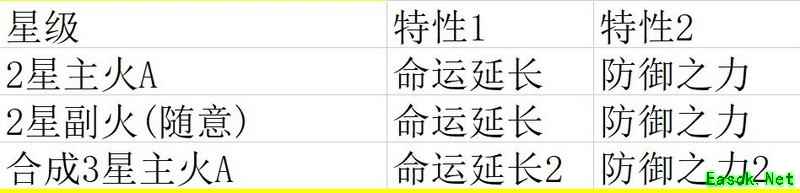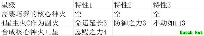 随意选取两个2星黄色神火,刷出命运延长与不动如山特性后即停,无需刷满全部特性。随后将主火C与副火融合,最终使3星主火C同时拥有2级命运延长和2级不动如山。