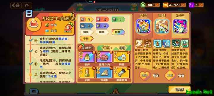 除了五格和六格外的菜品,其他只需满足解锁条件即可。例如沙拉需要蔬菜或水果,只要上一个符合条件的食材就能解锁下一道菜,不必追求S评级,因为S级唯一的用处只是占用菜谱位置。
