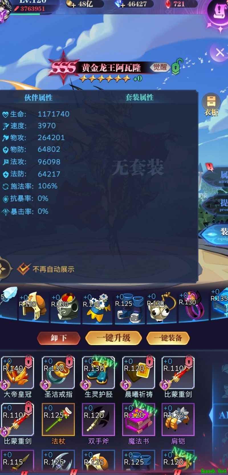 比如在输出时,许多人都穿血战装备,导致竞技场中对手几乎秒杀。每天要完成60次施法任务,耗时很长,结果却要求累计施法1200次,让人忍不住抱怨太离谱。下图是我刷觉醒时用的装备(龙王仅为模板,实际已觉醒),对比可见,穿与不穿装备,属性差距其实很小。