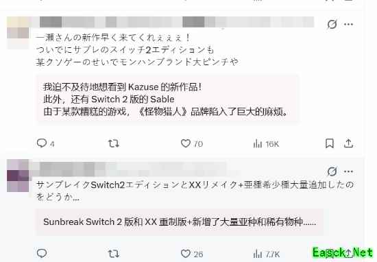 玩家们也提出了不少请求。许多人希望一之濑泰范负责《怪物猎人》系列下一部正传作品,并称他为 “系列唯一的希望”,这一情绪大概率与《怪物猎人:荒野》口碑不佳有关。还有不少评论希望他把自己担任总监的《怪物猎人:崛起 曙光》与《怪物猎人 XX》移植到Nintendo Switch 2平台。一之濑泰范目前正在筹备什么项目仍需等待时间揭晓,但就现阶段而言,能看到他依旧专注于这个系列,令人感到欣慰。