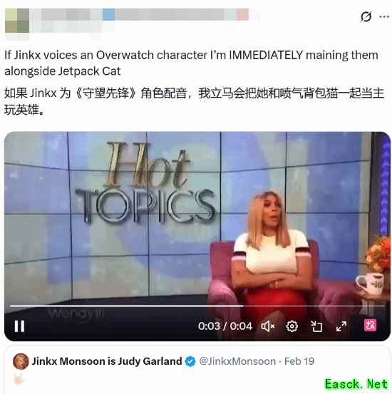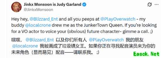 有玩家在社交平台发文称:“如果金克斯为《守望先锋》角色配音,我会立刻把这个角色和飞天猫一起当主力玩。”另一位玩家激动表示:“金克斯绝对能驾驭《守望先锋》的配音角色,尤其是那种风格夸张的角色。我已经脑补出一个狂热的女性智械形象。光是为了听她的配音,我就会疯狂玩这个角色。”