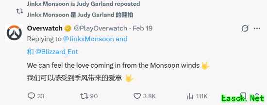暴雪官方也留言进行了隐晦暗示:“我们能感受到来自季风的爱意。” 而距离蒙逊公开向《守望先锋》开发团队请求为角色配音,已经过去了整整八年。