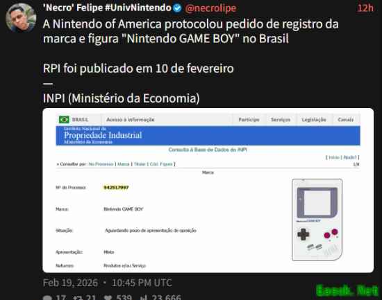据外媒twistedvoxel消息,任天堂已在巴西提交“Nintendo Game Boy”文字及标识商标申请。