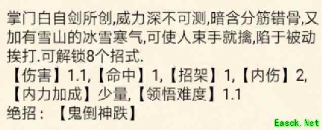 绝技神倒鬼跌:造成1.5倍伤害,命中率3,附带2点内伤,少量提升内力效果。