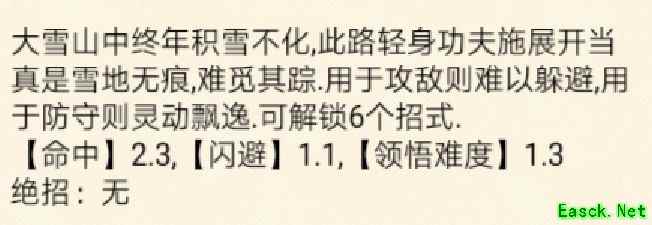 踏雪无痕,命中2.3,闪避1.1,领悟难度1.3,轻功绝学,行踪难觅。