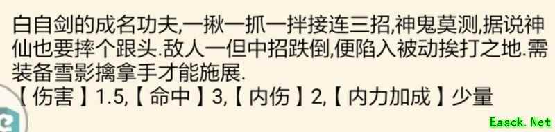 「雪影擒拿手」:伤害略高,命中与招架均衡,内伤效果显著,附带少量内力加成,领悟难度适中。