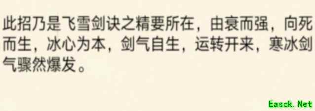 「飞雪剑诀」:伤害1.4,命中3,招架1,内伤1,身法加成极高,领悟难度1.8,属高阶剑法,飘逸灵动,攻守兼备。