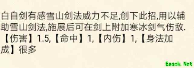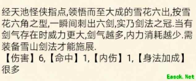 绝招:雪花六出,造成6点伤害与6点命中,附带1级内伤,大幅增加身法效果。
