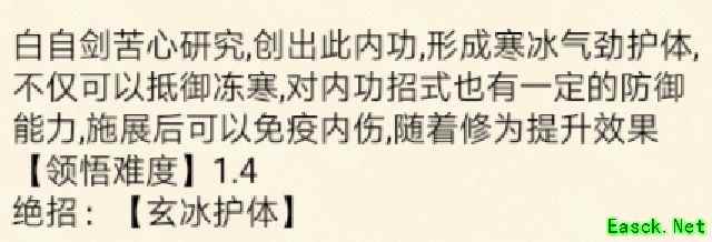 绝招:玄冰护体,可使自身在接下来五回合内,将所受伤害的50%以内力按1:2比例抵消(1点内力抵2点伤害),内力消耗比例恒定,不随等级变化。