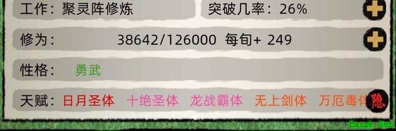 4.4版本更新后,选择红体加天灵根时更容易附带额外天赋,但令人不解的是,在拥有34个天赋的情况下,隐藏体质的触发反而变得更难。尽管如此,只要红体与天灵根组合仍保有约八成概率携带隐藏体质。若不介意此变化,可继续培养,即便后期转为万厄路线,三至五百年内清场重来,也能积累三到四万战力。