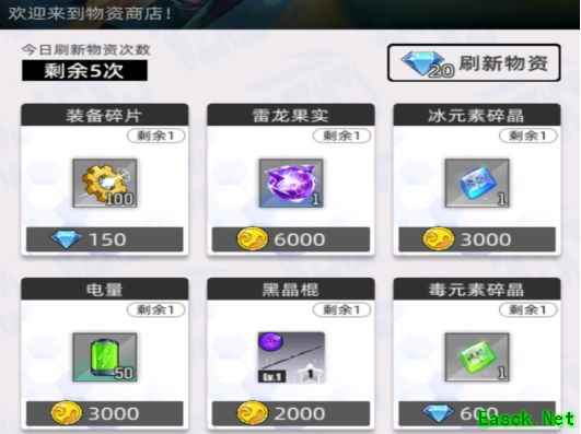 五维商店每天刷新物资类商品,包括电量和素材等物品。
