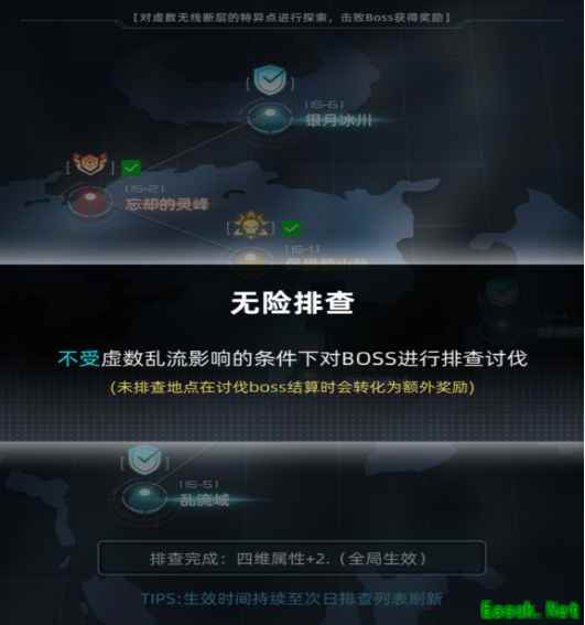 在未遭遇虚数乱流的情况下完成无险排查并击败Boss,可获得额外奖励——虚数魔方。每个地点固定包含1个奖励、1个Boss、2个增益效果和2个减益效果。