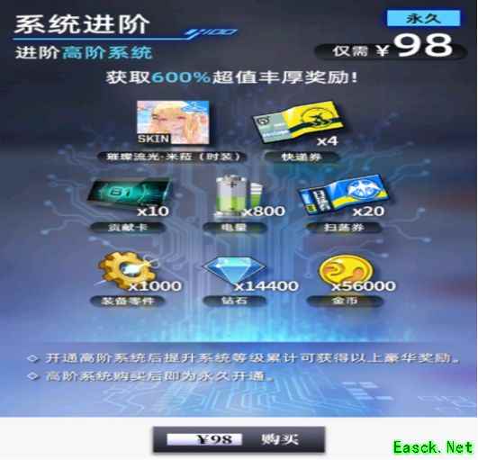 目前游戏中仅推荐两种常驻付费内容:主角皮肤售价60米,可使单局游戏获得的金币数量及金币上限翻倍,有效缓解资源紧张;系统界面中的高阶系统售价98米,虽能获取大量资源,但全部领取所需周期较长。