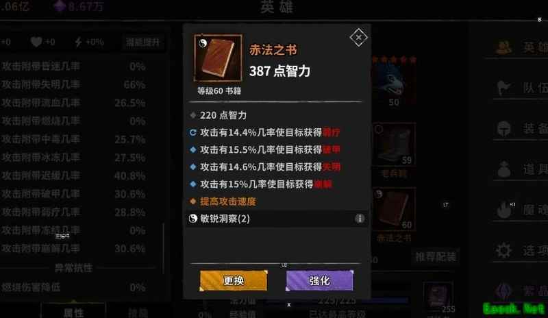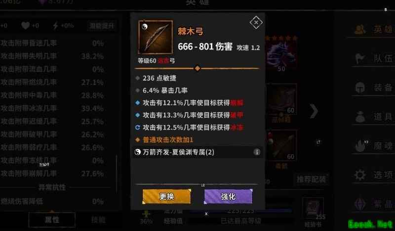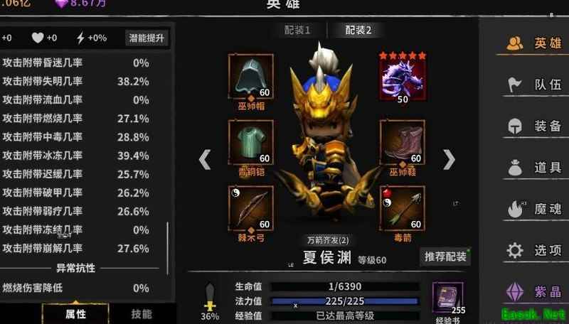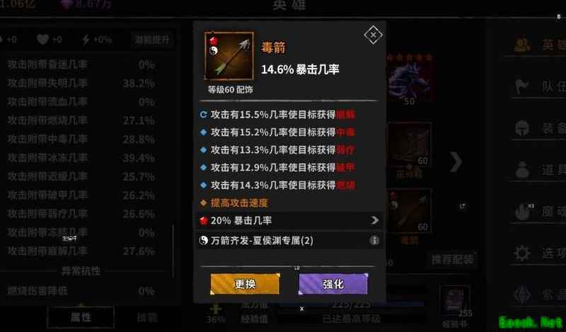 夏侯渊的专属技能可将普通攻击转化为群体伤害,且其普攻为物理性质,配合魔魂与装备特性,能有效削减敌方行动条,造成罚站效果,避免在挑战高层时出现意外翻车。核心需求为两件夏侯渊专属装备。主武器需洗练出对流血目标提升暴击的词条(秒怒马阵容除外),副手需镶嵌红宝石。若搭配秒怒马超阵容,角色面板暴击率应达到70%;若不使用该组合,则需将暴击提升至90%。由于夏侯渊普攻自带流血效果,因此异常状态类词条无需堆叠流血、冻结或眩晕。在确保足够暴击率的前提下,其余主要属性应优先选择攻击速度,具体数值可根据实际暴击情况进行灵活调整,以实现输出效率与控制节奏的最佳平衡。