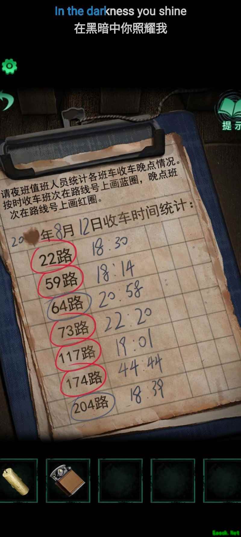 打开密码箱后会浮现一只高跟鞋,但纸人不愿交出。此时下车处会出现手指提示,依照指示顺序点击纸人的手,便可取得高跟鞋与蜡烛。随后用高跟鞋敲碎公交车玻璃,即可成功下车。