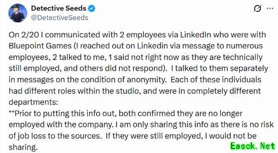 2月20日,爆料人Detective Seeds通过LinkedIn匿名采访了两名已离职的蓝点工作室前员工。两人职位不同、分属不同部门,且均已确认离职,因此爆料不会对其工作造成影响。