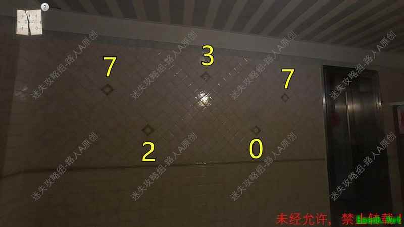 对照完整拼图与墙上的瓷砖,按瓷砖位置确定对应数字,再从左至右依次排列,最终得出密码为72307。