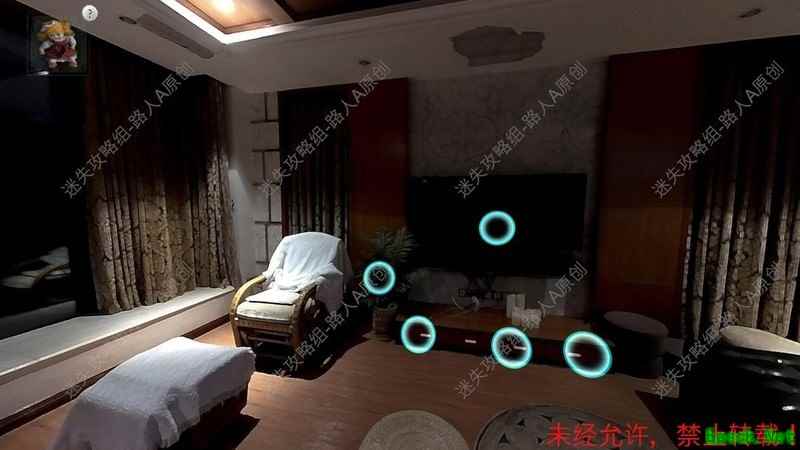 点击闪烁的圆形标记,依次收集、、及。需调查电视、电视下方抽屉、盆栽与扶手椅四个位置,完成全部线索搜集。