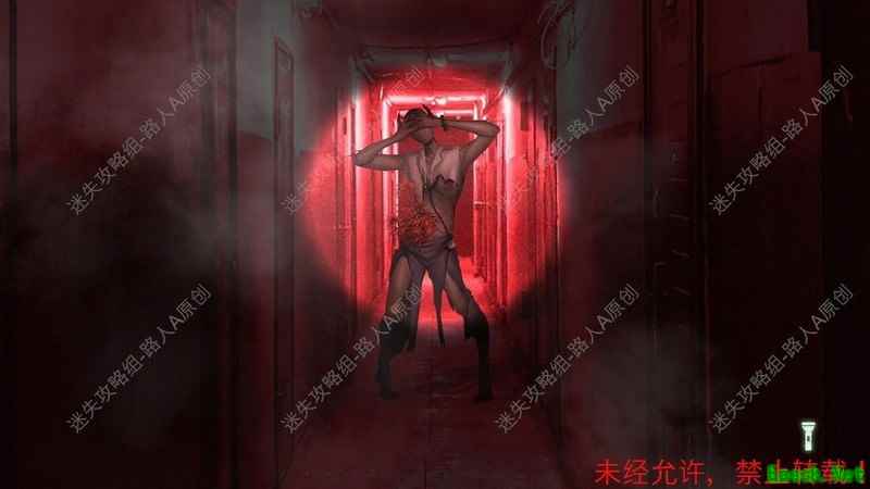 一直向前走,途中遇到怪物时用手电筒照射即可通过,无需等待怪物消失,照到后可立即继续前行。
