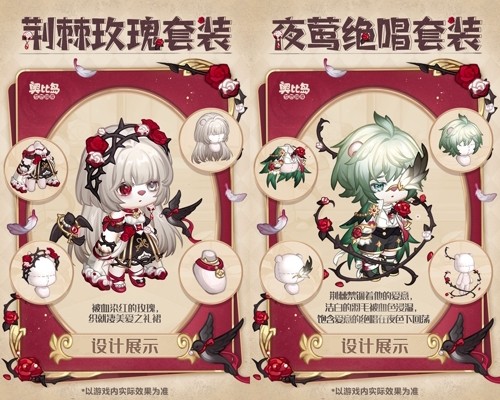 奥比生活新系列「荆棘玫瑰套装」「夜莺绝唱套装」、「绯羽誓约发夹」「玫瑰荆棘系带」「玫瑰荆棘挎包」系列散件、「荆棘玫瑰亭桥」「夜莺玫瑰花」家具以及「玫瑰挽歌」背景卡已于今日上线。本期还有奥比生活塔罗系列装扮返场,本期生活达到一定等级即可获得「月涟幻梦套装」「灵魂审判套装」的购买资格,喜欢的奥比不要错过!