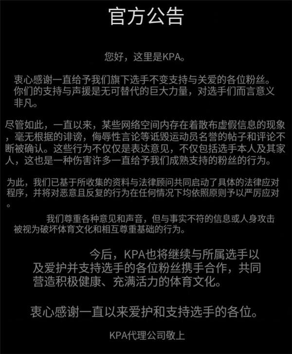事件持续发酵后,Oner 所属的经纪公司 Key Player 紧急发布官方公告,正面硬刚恶意网暴行为。公告中明确表示,已经确认网络上存在大量散布虚假事实、无端诽谤、使用侮辱性表达诋毁选手名誉的内容,这些行为早已超出了正常的意见表达范畴,不仅对选手本人及其家人造成了严重伤害,也伤害了众多理性支持的粉丝。经纪公司直言,已经基于收集到的资料,联合法律顾问启动了具体的法律应对程序,对所有恶意且反复的侵权行为,会在任何情况下都依照原则予以严厉应对,同时也表示尊重多样化的意见和声音,但坚决抵制与事实不符的造谣和人身攻击。