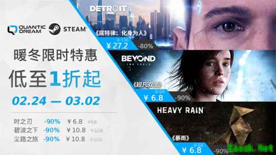 冰雪渐消,万物初醒。春风未至礼先到,Quantic Dream为您寄来了一封名为“特惠”的温暖来信!在这充满希望的时节,如果您正渴望一场触动心灵的旅程,那么现在就是启程的最佳时刻。2月24日至3月2日,QD旗下多部叙事巅峰之作献上“骨折级”诚挚好礼!《底特律:化身为人》2折领衔,其余神作仅需1折,6.8元个位数价格即可解锁一段段刻骨铭心的交互式人生!