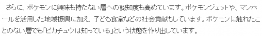 ·其次,积极提升对宝可梦没有兴趣的人群的认知度扩散工作,宝可梦除了创作物领域,积极推进各种社会活动,井盖文化、儿童食堂、线下大型活动等等都在发挥社会价值。