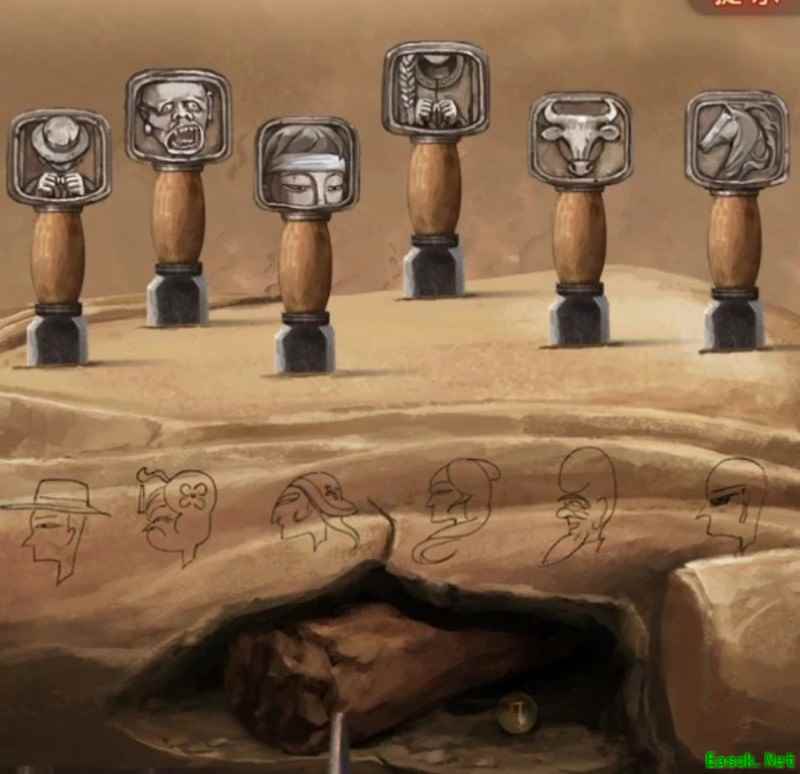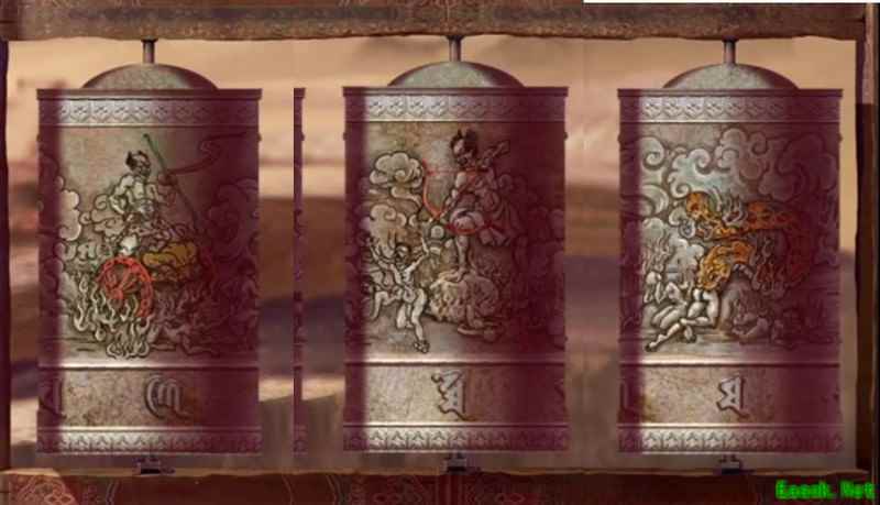 这个图案似乎有些熟悉,先退回到沙漠场景,观察中间的旋转圆筒,记录下车轮、弓箭以及龙形图案对应的符号。其实这里更像是条大蟒蛇,不过具体是龙还是蛇并不影响解谜。如果对最后一个符号判断不清,可以将可能的选项都记录下来,逐一尝试即可。面对有歧义的谜题时,穷举法往往是最直接有效的解决方式。
