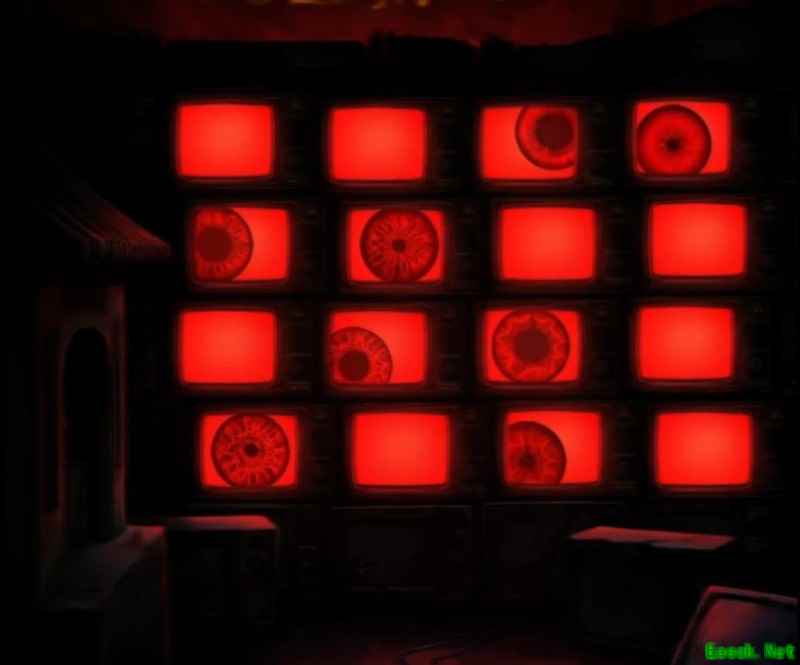 进入正确位置后即可离开此空间返回沙漠,随后再次进入佛像下方的监控室,看到商标旁用红笔标记的>3^4。这可能意味着向右移动3格,向上移动4格。按照这个规则,起点应为左下角,从左下角的显示器开始,向右3格、向上4格,对应的是第一排的第三个屏幕。查看该屏幕上的商标,果然显示出了图案。