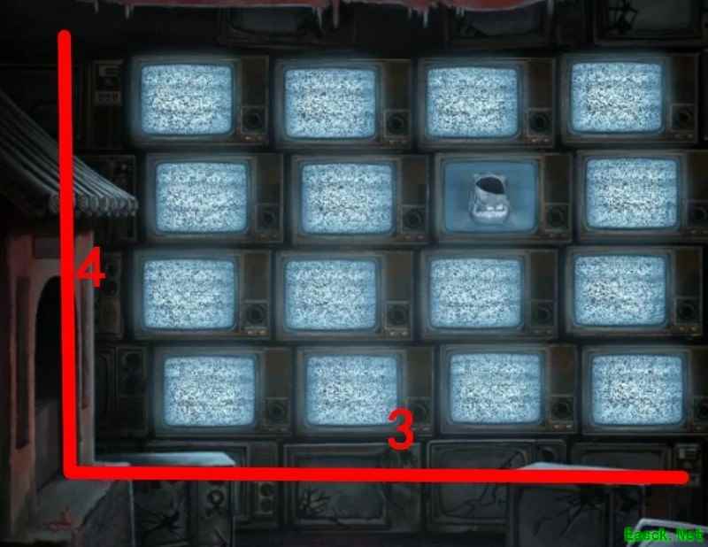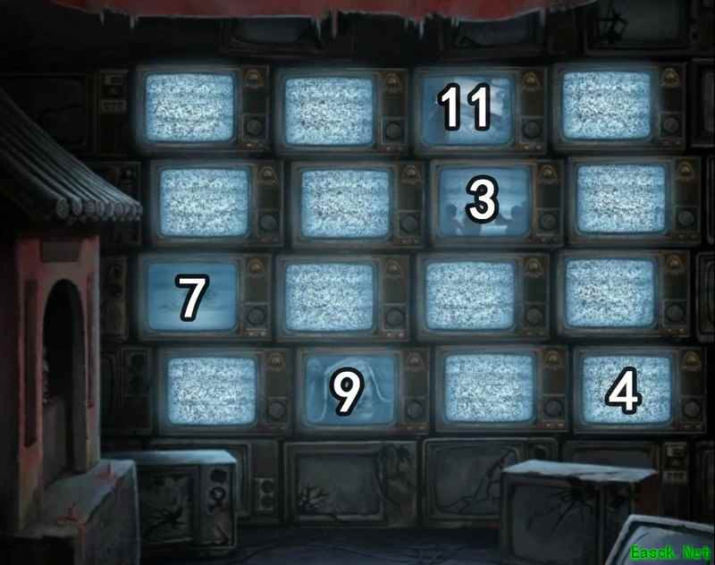 需要调整的地方是:每个电视画面中会出现画着月老的纸条,只有在这个画面中才能看到纸条上的数字提示。第一行第三个电视显示数字11,第二行第三个是3,第三行第一个是7,第四行第二个是9,第四个是4。将对应位置的电视调到相应频道,完成后会有特别效果出现。