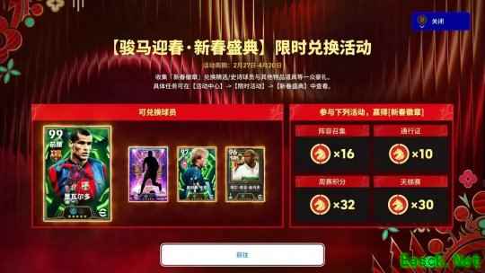 在【骏马迎春·新春盛典 限时兑换活动】活动期间,玩家通过完成阵容召集挑战,参与活跃活动即可获得【新春徽章】,每周均可获得一定数量的【新春徽章】,最多获得88枚。玩家消耗【新春徽章】可以兑换双增能史诗 里瓦尔多(特殊技能:旋风盘带、掠地瞬击)、埃尔-哈吉·迪乌夫、奥利弗·卡恩,以及双增能梦幻精选 中后卫等强力球员。