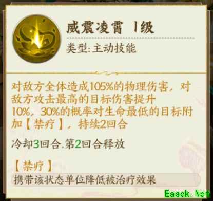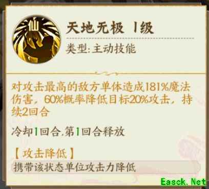 技能效果:天地无极,可降低敌方攻击力最高英雄20%的攻击。