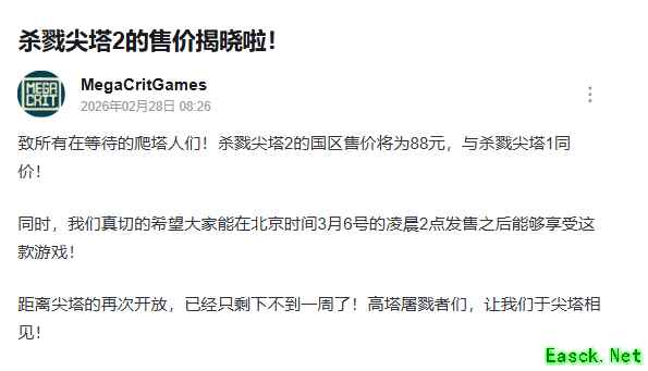 今日,《杀戮尖塔2》制作组MegaCritGames在B站发文表示,《杀戮尖塔2》国区售价确认为88元人民币,与前作一致。