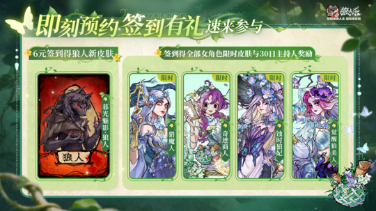 即日起参与签到活动,6元签到即可解锁狼人新皮肤“暮光魅影·狼人”。活动期间参与每日祝词活动,连续签到更可获得全部女性角色限时皮肤奖励,并可额外获取30日主持人奖励。海量福利,尽在网易狼人杀“她”说活动。