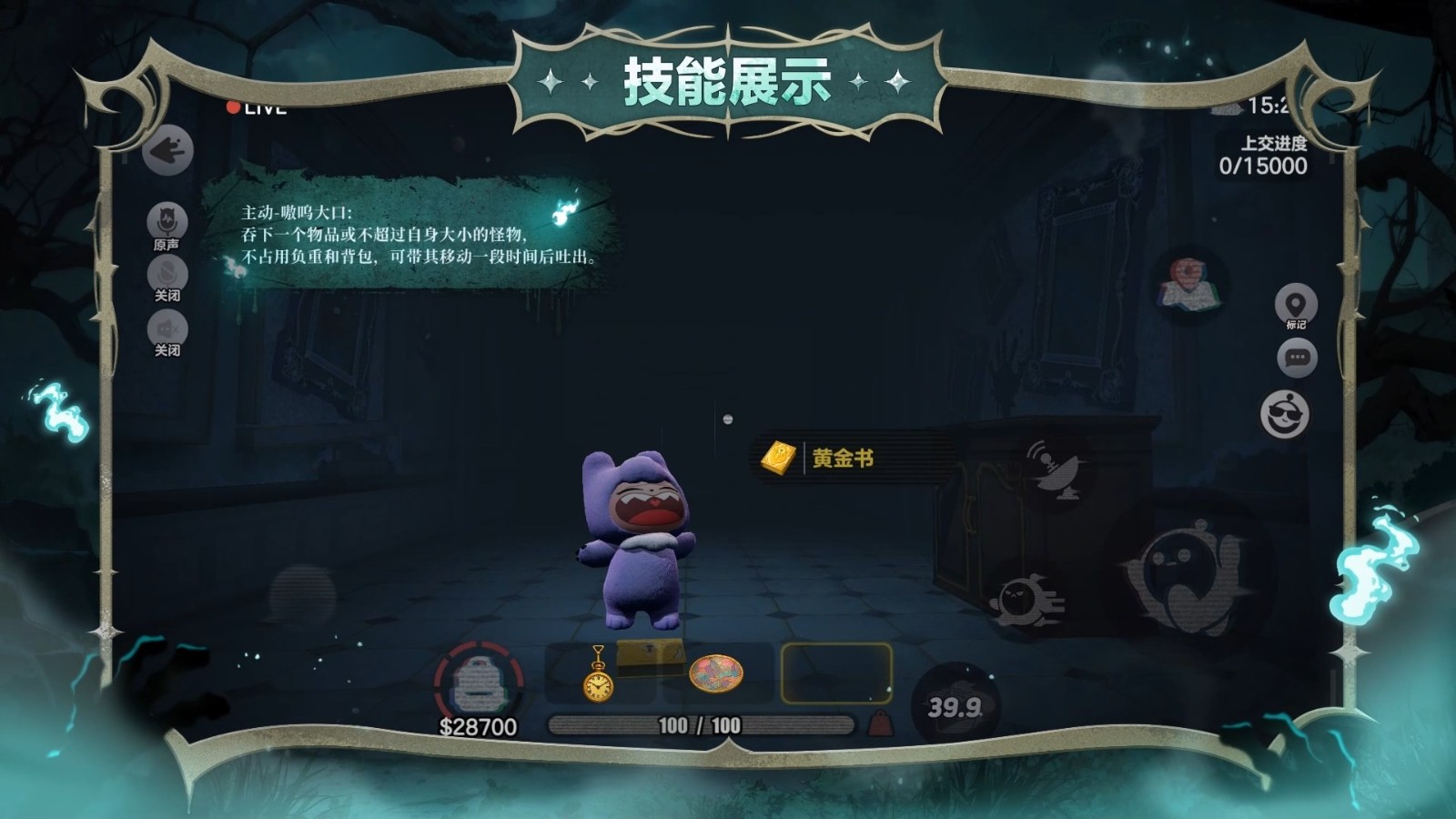 主动-嗷呜大口:吞下一个物品或不超过自身大小的怪物,不占用负重和背包,可带其移动一段时间后吐出。