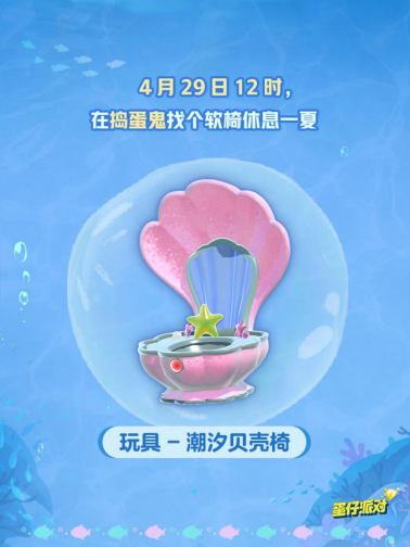 4月29日12点,揪出捣蛋鬼玩法上线新座椅<潮汐贝壳椅>,成功抽取即可同时拥有捣蛋鬼椅子和可在蛋仔岛使用的同款玩具!