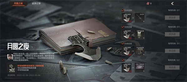 【月圆之夜】主题活动于2月18日-3月4日限时开启。正逢月圆,谍报活动猖獗。身份不明的谍报人员伪装成NPC潜伏于暗区。暗区先锋于所有战斗场景击败游荡者,即有概率截获“潜伏徽章”,成功带出潜伏徽章即可兑换高级装备等物资。